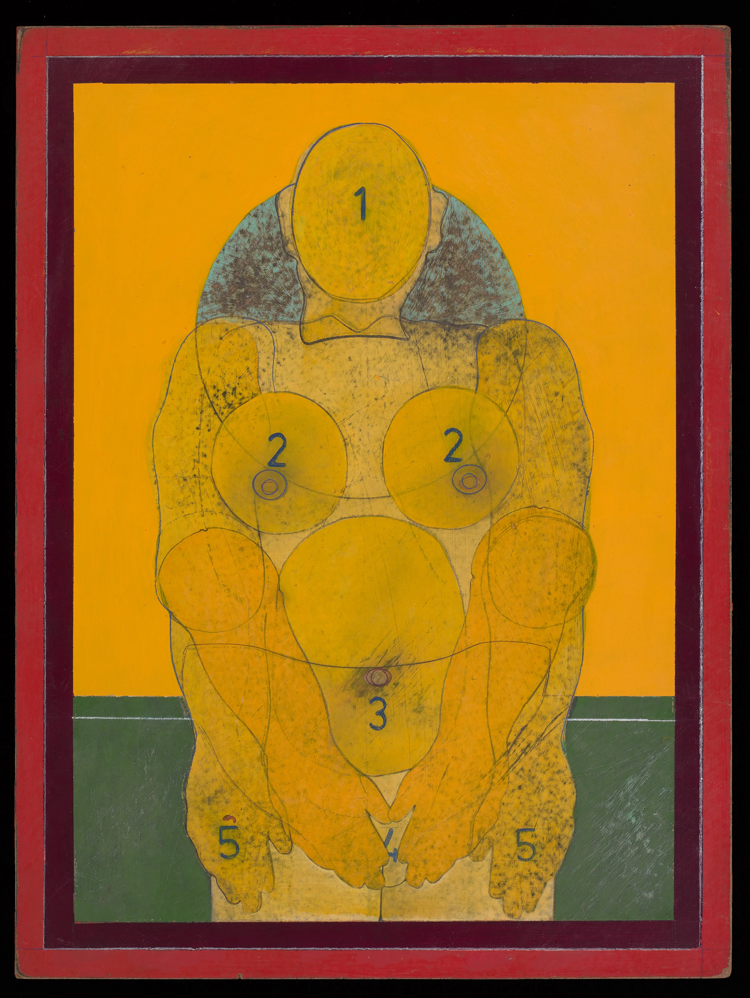 The exhibition consists of some ninety paintings and drawings with several projections and is accompanied by texts, being a subjective view of part of Greenaway’s image and text creativity. Content-wise they are of listings of individual body parts, moving to considerations of groupings relative to family trees, collective groups, single and group portraits, depictions of film and theatre casts, audiences, double portraits and heraldic dynasties.