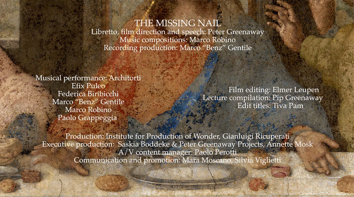 The music for film of the The Missing Nail was composed by Marco Robino and performed and recorded by The Architorti Quintet who are based in Turin. The narrative is a short tale on paper converted into a libretto to be used as the text for an oratorio offered to Marco Robino to be used as he wished to turn into a live musical performance which has been performed before many audiences in Italy including Venice, Milan and Rome, with Peter Greenaway voicing the text. It looks forward to repeat the performance at future venues.